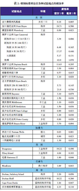 世界各地都進行過各種應用環(huán)境下的金屬腐蝕性能比較試驗。以碳鋼為標準樣品對這些試驗地點的腐蝕性進行了比較。表2給出了標準樣品在北美試驗地點的腐蝕率數據。盡管某些地點處于經常使用除冰鹽的地區(qū),但樣品并未暴露于除冰鹽之下。